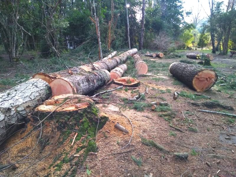 Work on the chapel site began by clearing some large trees that would shade the building.  These trees will also provide the needed lumber for the chapel construction.