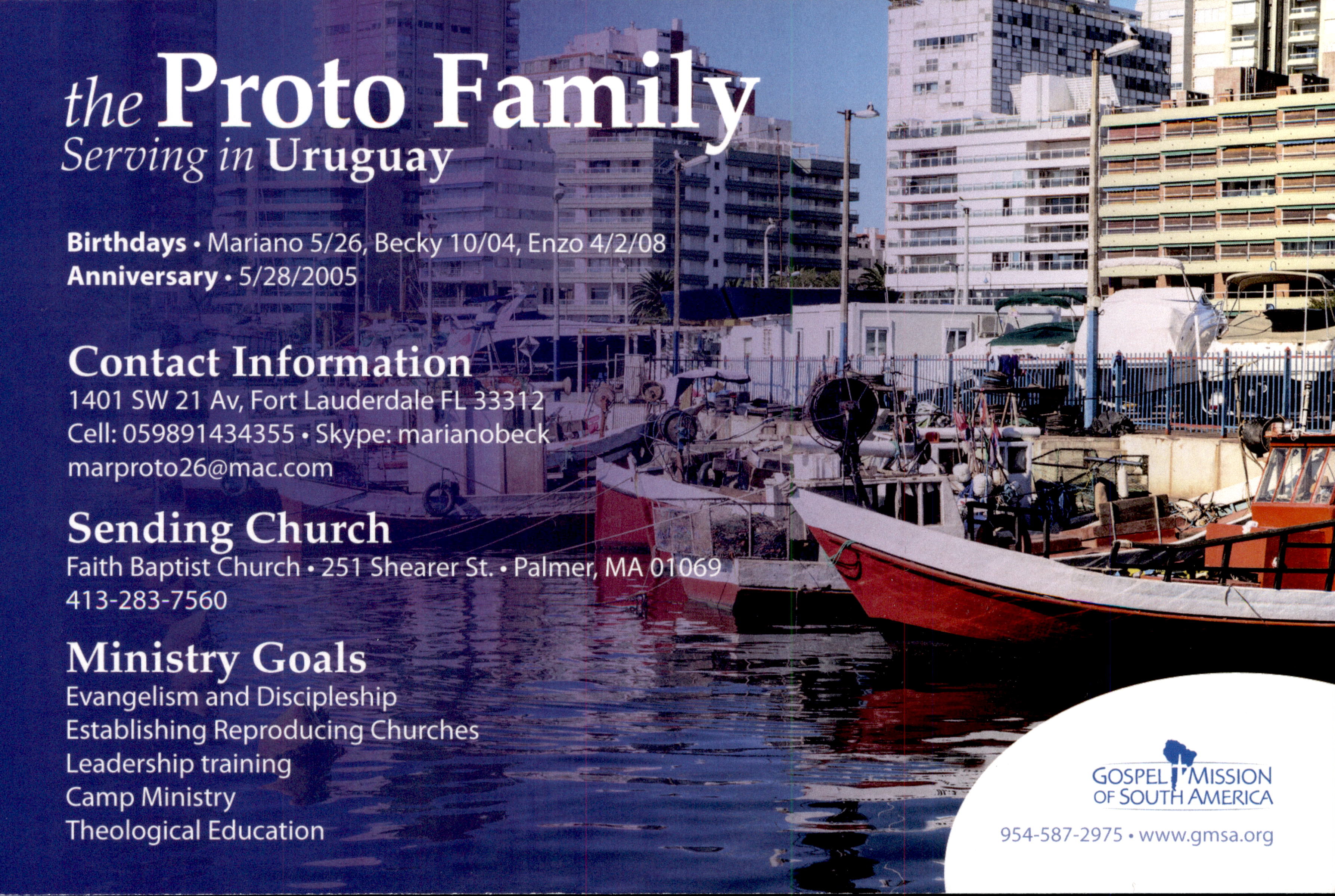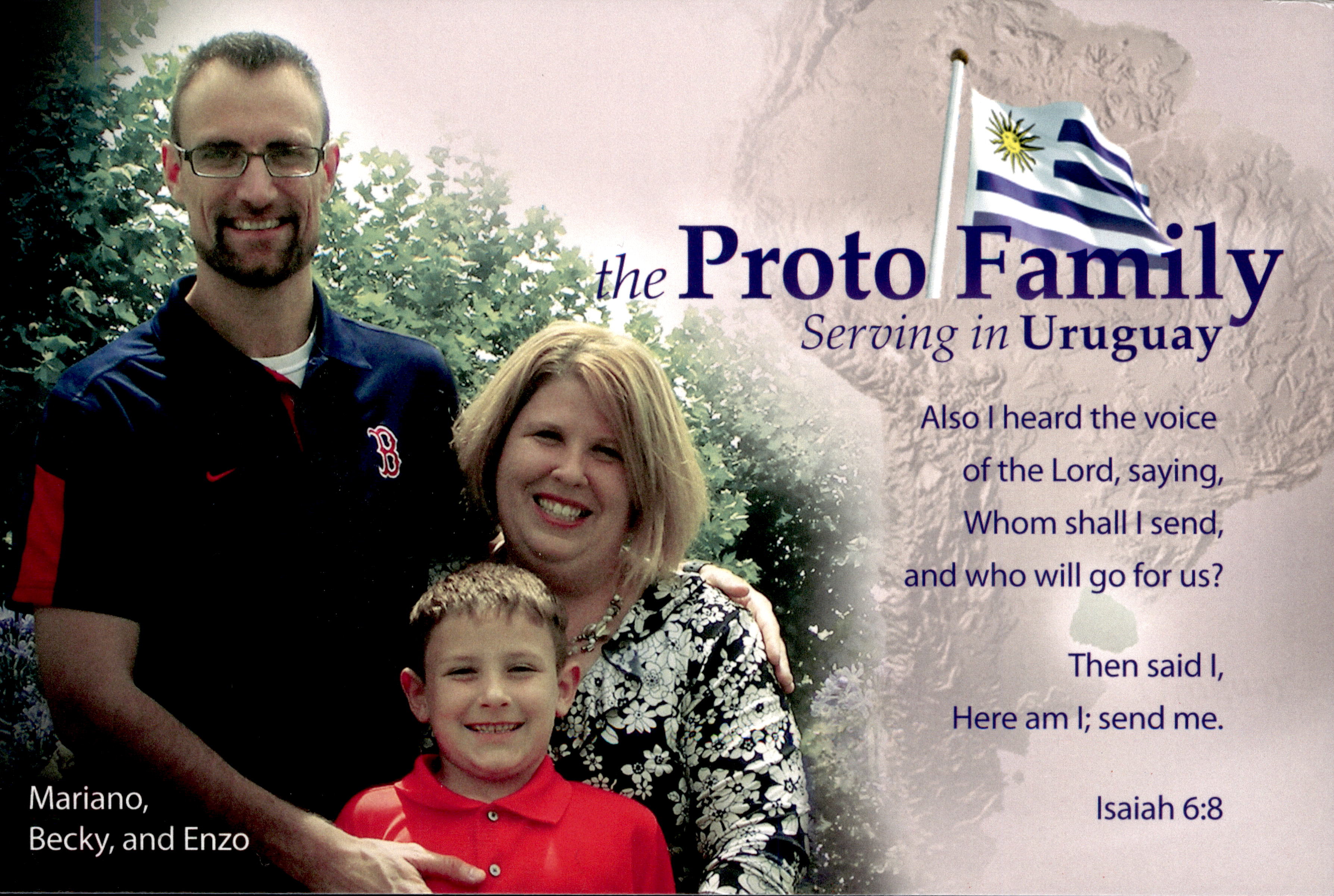 God has burdened our hearts to reach lost souls for Christ in the land of Uruguay. Starting in December 2015 when we return for our second term of service, we plan to begin to establish a new church in the city of Carmelo. We have a desire to bring the Gospel to those that have never heard it before and to those who believe there is no God. If you have any questions, please feel free to contact us using the link at the right. Thank you for taking the time to read this, and please pray for us! Mariano's Testimony: I grew up in a Catholic home. My parents always taught me to do right, and I thought because of that I would go to heaven. One day I met a missionary and he explained to me the plan of salvation through the Bible. That day I realized that I was a lost sinner and Christ would save me if I believed what He had done for me on the Cross of Calvary. On January 5, 1992, I was saved (Romans 10:9) Becky’s Testimony: I had the privilege of being brought up in a Christian family. I heard the Word of God at home, at church, and later at the Christian school that I attended. It was at the age of 8 that I finally realized that even though my entire family was saved, I attended church regularly, and I tried my best to be “good” that none of these things would get me to Heaven. At age 8 I asked Jesus to forgive me my sins, and I accepted Him as my Savior. |