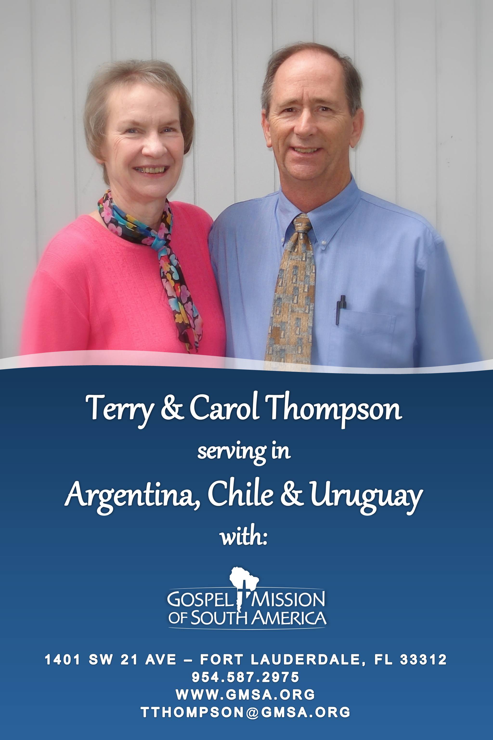 Terry & Carol Thompson - General Director, Furlough Replacement ![]() The Lord led Terry to serve in Chile for a year with GMSA in December 1970. Carol joined the team in 1973 and we married on July 14th and arrived in Chile for our first term in December. The first two terms were primarily serving in the Chiloe Islands with a boat ministry, tent evangelism and establishing local churches. Our third and fourth terms involved establishing a local church in Santiago - a city of six million souls - and field leadership. The Lord led us into directing the Mission from the Ft. Lauderdale headquarters in January 1994 and we continue to oversee and coordinate the three sending countries and the three “fields” endeavoring to encourage and help the Lord's servants at home and overseas. The Mission has graciously allowed us, at times, to replace certain missionaries while they furlough, giving us a much needed update of what field ministry is like for our missionaries. We are currently preaching the Word of God in Gualeguaychu, Argentina. Prayer Requests: 1. Wisdom to lead and encourage others. 2. Souls to be saved (the Lord is glorified and the missionaries are encouraged). 3. New missionaries for the fields and new board members for the homelands. 4. For our three children and their families serving in Chile. |