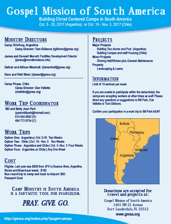 Just in: An updated flier on the 2017 work trips planned for October/November to Christian camps in Chivilcoy Argentina and Santiago, Chile. Read here for more details on the trips. And check here for more about GMSA’s Christian camps. Contact us through the website or the email addresses published in the flier if you are interested in going!