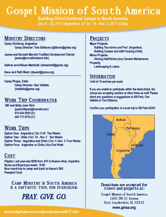 Are you interested in advancing the work of Christian camp ministries in South America? In October 2017 we have two trips planned for work in Chivilcoy, Argentina and Santiago, Chile. Please visit our website for more details or to contact us. This information is subject to slight changes, so stay tuned!